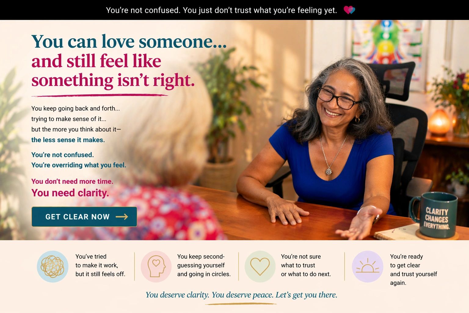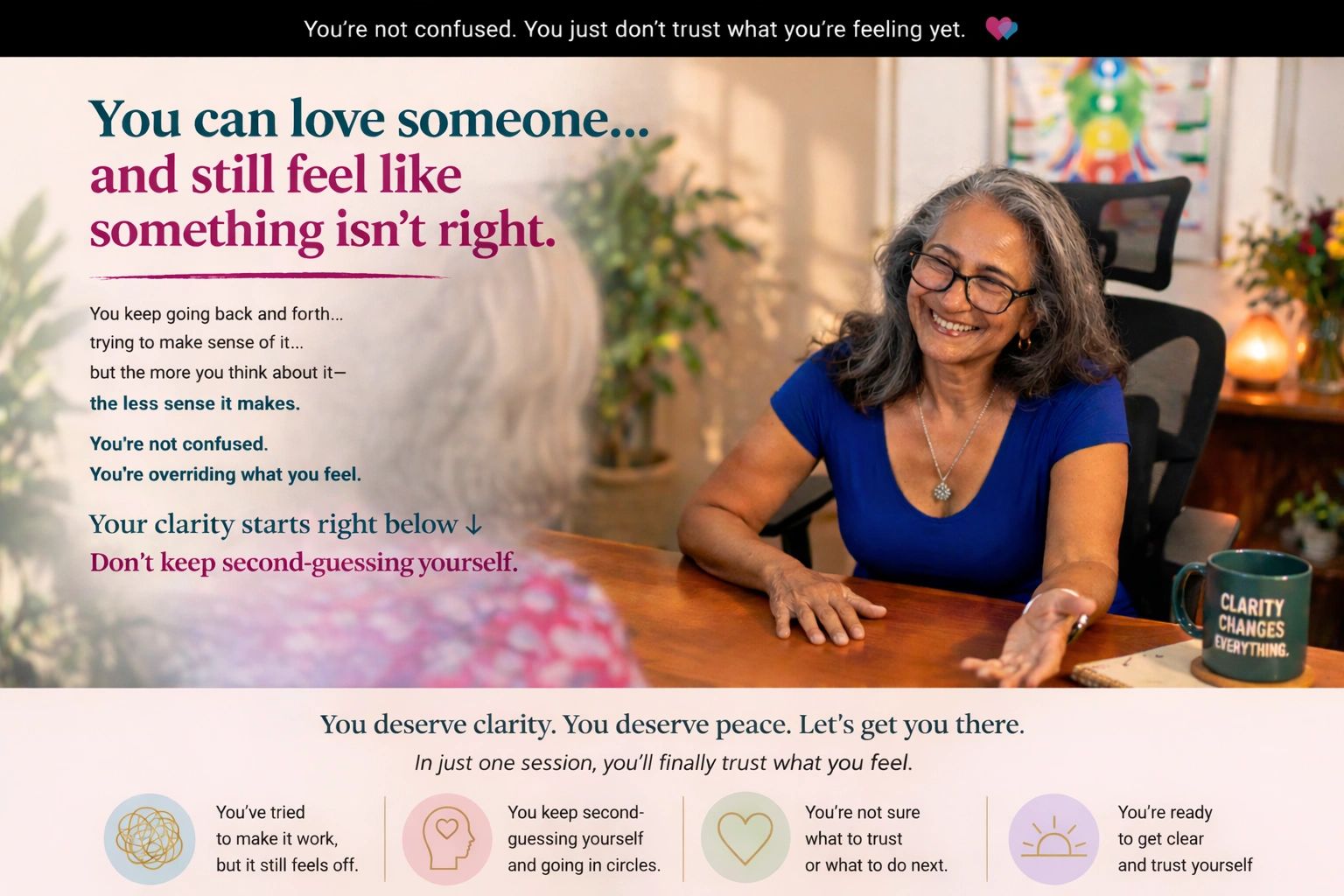 In this focused 30-minute session, we slow everything down so you can stop second-guessing yourself and finally trust what you already feel.